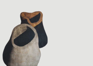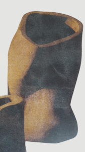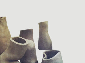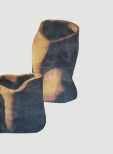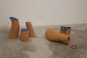 These small sculptures were created starting from the artist’s arms. We can find this spontaneous sculptural gesture even many centuries ago, the tiles of the houses for example were made starting from the roundness of the thighs. In fact, the work has to do with a general organicity. Some cyanotypes are applied on some of these sculptures. These images are several lumbar problems the artist took from back x-rays. This material was found in the streets of Brussels randomly, apparently belonging to a so-called Héloïse. Therefore, the work has to do with an impossible reconstruction of a character, hypothesizing an identity that is not necessarily human. Furthermore, Héloïse studies depict the series of clay sculptures on paper before being fired.
