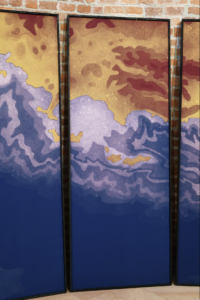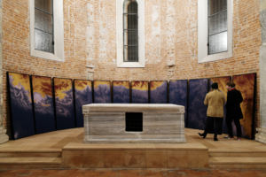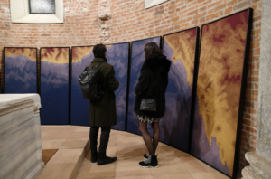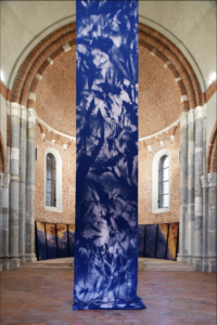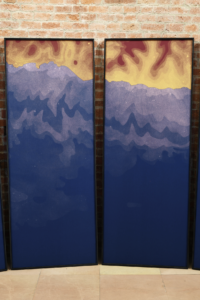 This is an installation initially designed for the semi-circular apse of the San Celso Church in Milan. It is composed of twelve cotton panels depicting the map of the Liguria coastline. Sequences of shades and colors create a visual pattern, careless of any geopolitical depiction of a map.in the initial context of the exhibition in which littoral was exhibited for the first time, the work also referred to the miracle of the two saints founders of the church who escaped a shipwreck on the coasts represented. The story had a parallel with the complex facts of migration nowadays.