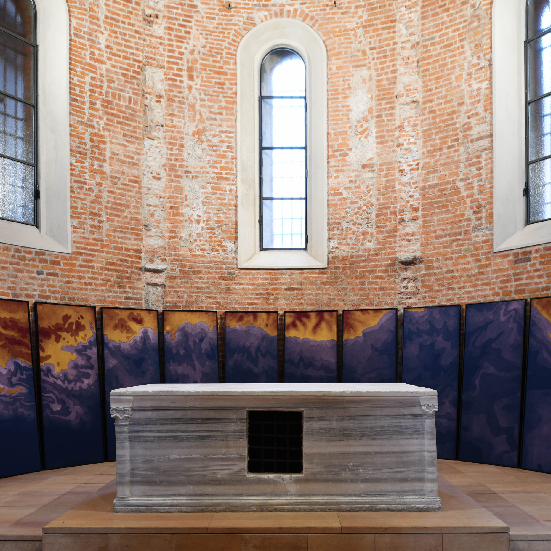 This is an installation initially designed for the semi-circular apse of the San Celso Church in Milan. It is composed of twelve cotton panels depicting the map of the Liguria coastline. Sequences of shades and colors create a visual pattern, careless of any geopolitical depiction of a map.in the initial context of the exhibition in which littoral was exhibited for the first time, the work also referred to the miracle of the two saints founders of the church who escaped a shipwreck on the coasts represented. The story had a parallel with the complex facts of migration nowadays.